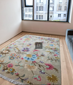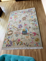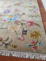 Floral Muted Rug The colorful rug features accents in rust red, gold, orange and pink, The modern Turkish rug is handknotted in premium quality wool with about 15 to 30 knots per square inch. So the living room rug is super soft but not cumbersomely dense. The wool rug is 100% cut pile and doesn't shed making it just the rug you want for homes with pets or little ones.